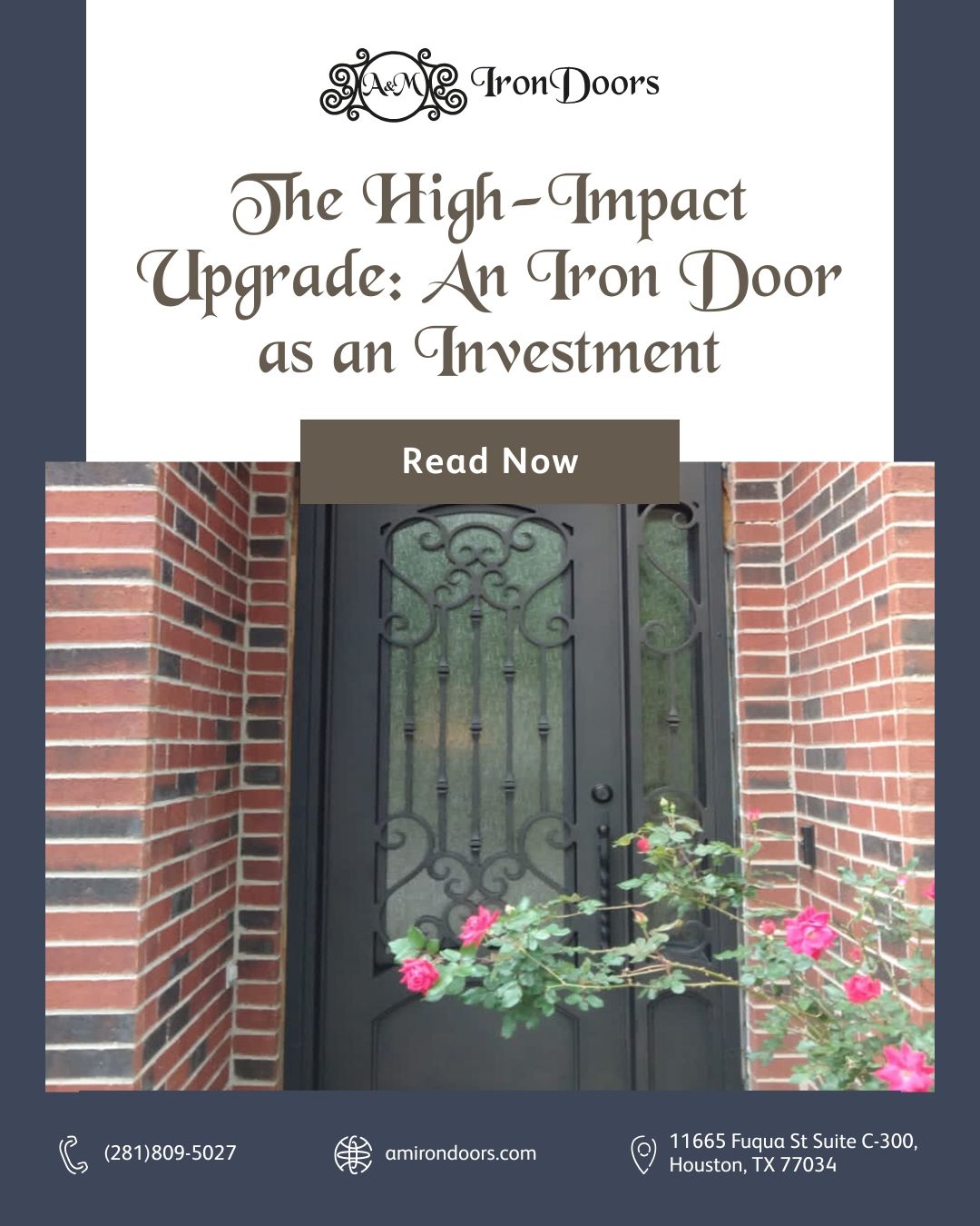 A&M Iron Doors is a family-owned business with over 20 years of experience crafting high-quality custom iron and steel doors. Based in Houston, TX, we manufacture our doors in Nuevo León, Mexico, ensuring exceptional craftsmanship and durability. Our showroom, located at 11665 Fuqua St Suite C-300, Houston, TX 77034, offers a variety of elegant designs for homeowners and businesses. We specialize in single and double doors, doors with sidelights, wine cellar doors, stair rails, and windows, blending security with sophistication. At A&M Iron Doors, we are committed to delivering superior quality, innovative designs, and outstanding customer service.